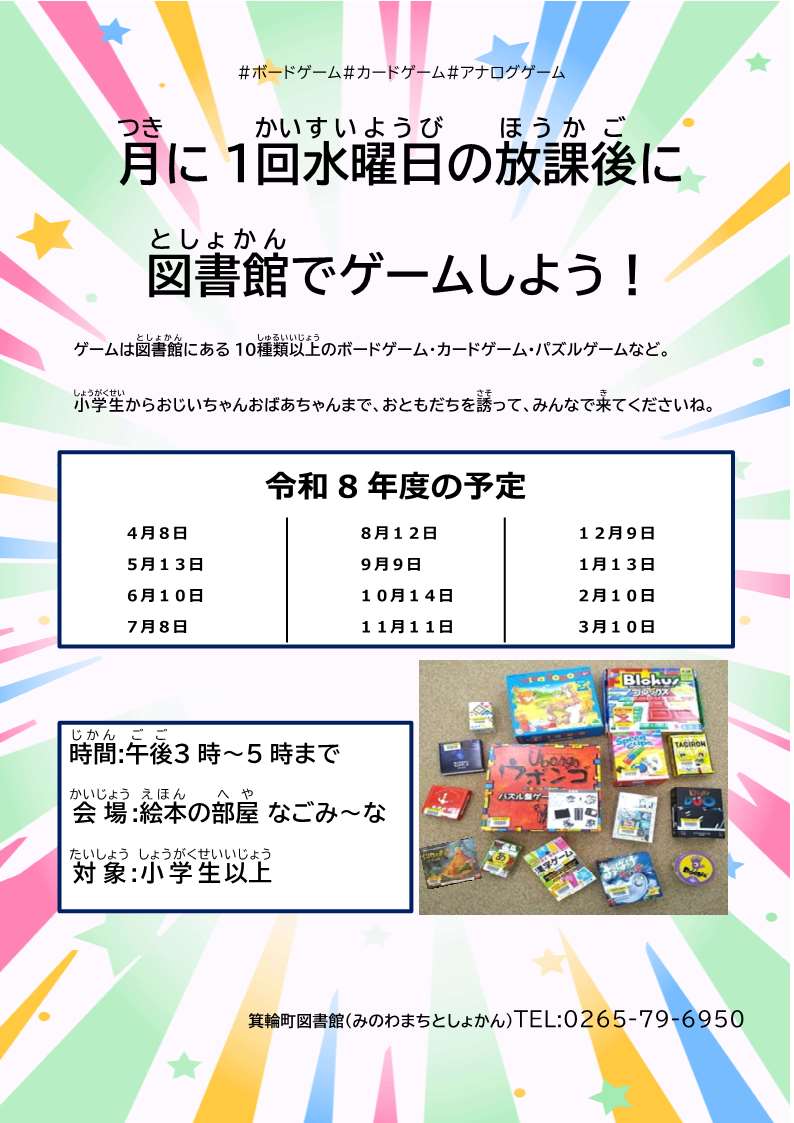 箕輪町図書館からボードゲーム・カードゲームで遊べる日のご案内です。