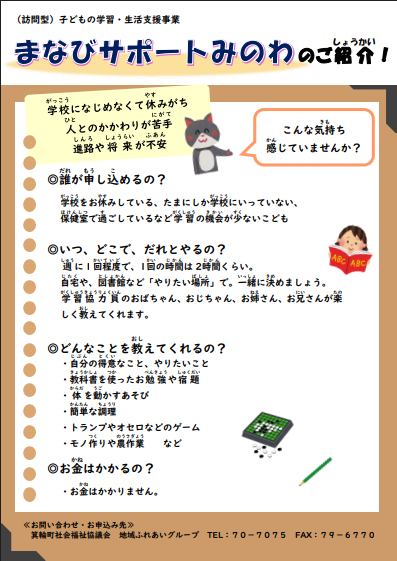 ※「まなびサポートみのわ」の支援内容等については、箕輪町社会福祉協議会地域ふれあいグループ(0265-70-7075)へお問い合わせください。